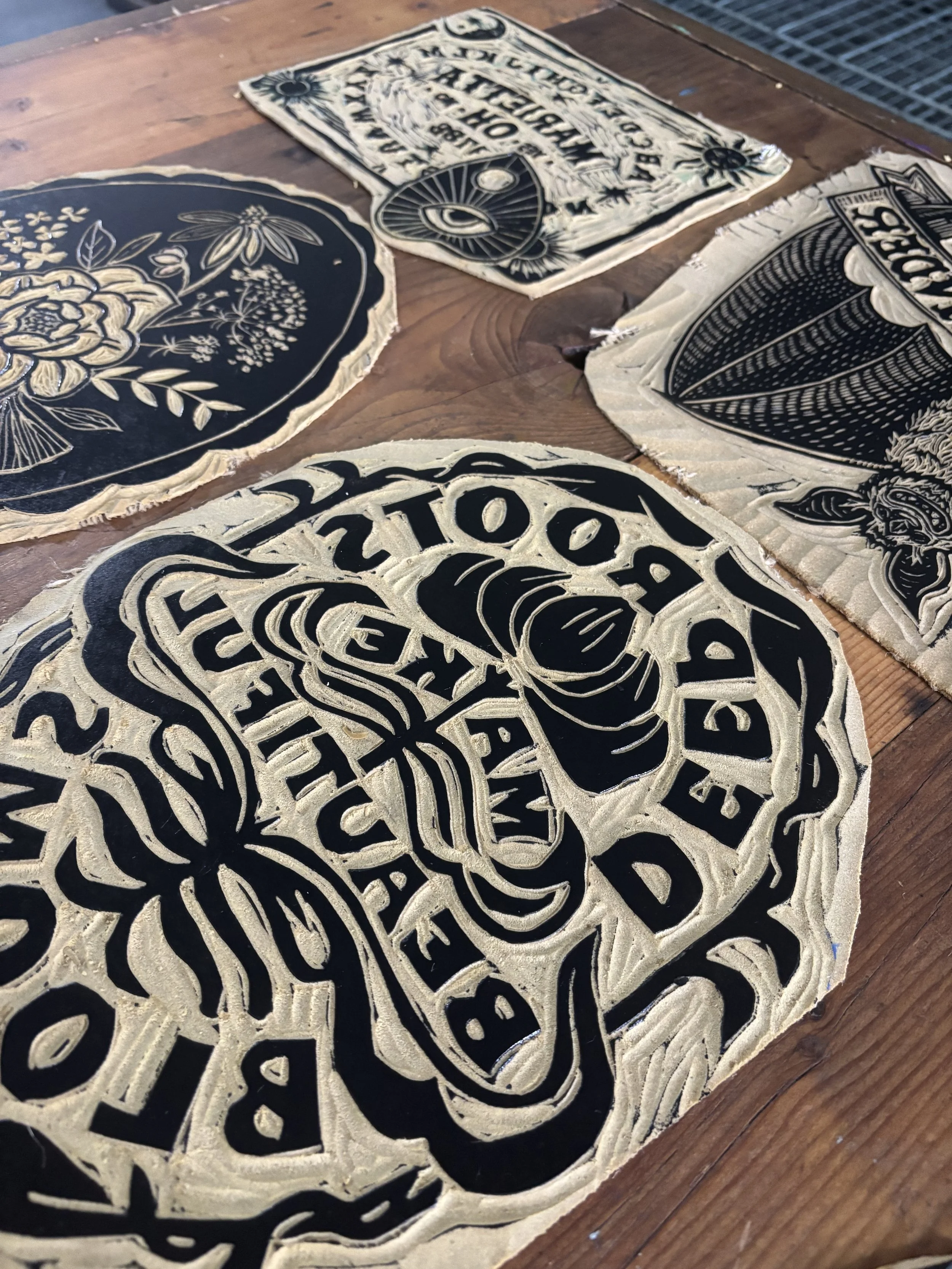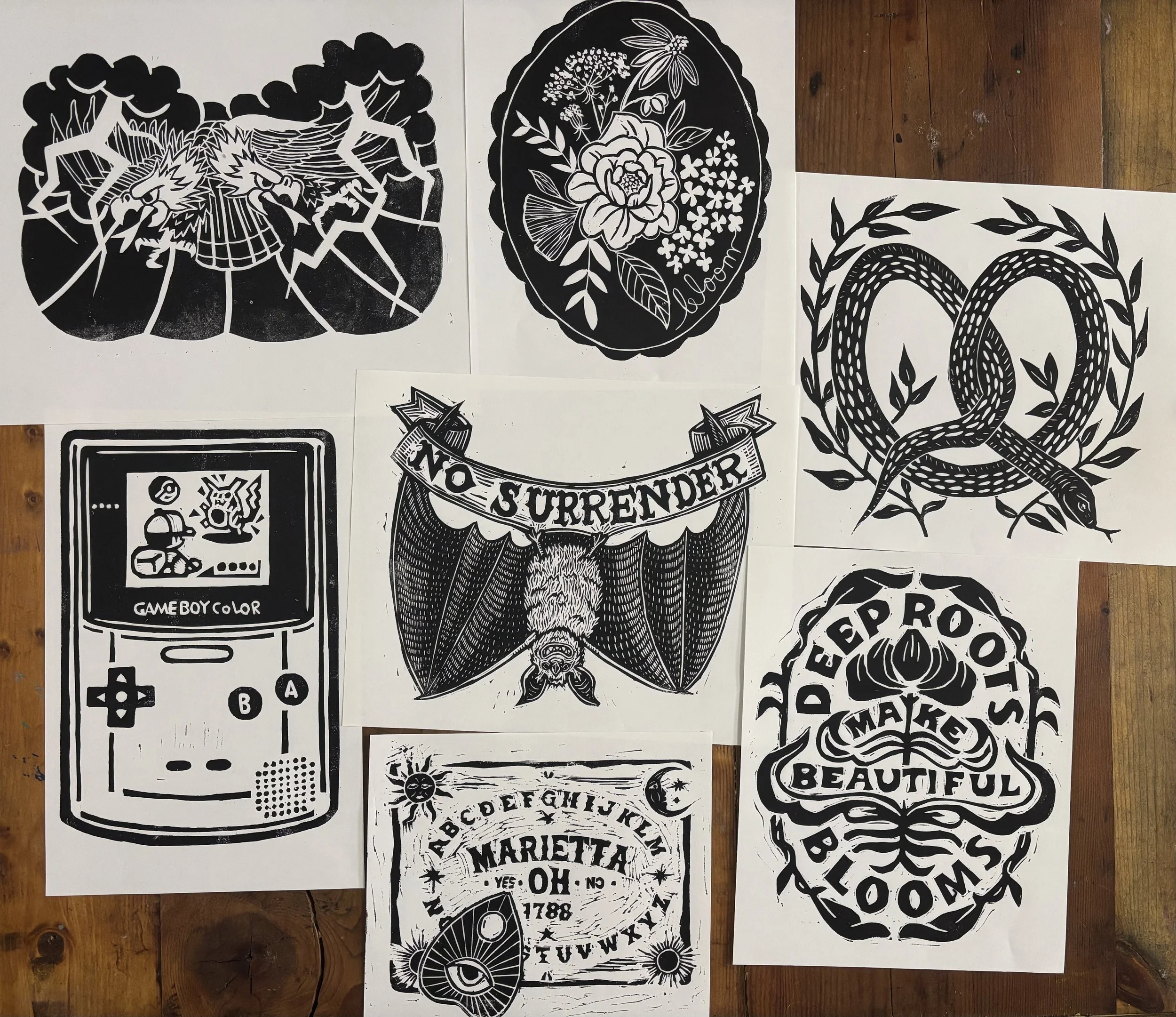 “The designs are totally up to the artist,” said Rosenstock, who also preps and test prints the blocks ahead of time to make sure they’re press-ready. The result is a diverse selection of hand-carved artwork.